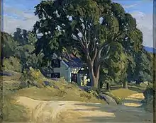 Writing in 1934 of that year's solo exhibition at the Macbeth Gallery, the critic for the Brooklyn Daily Eagle noted this sense of place and said Chatterton's point of view was "characterized by certain serene enjoyment of actualities that amounts almost to a philosophy of life." He also wrote that Chatterton's "manner of setting down his reactions has the integrity of his point of view which is characterized by directness and candor."[2][note 14] A year later another critic noted Chatterton's skill in rendering "the homey quality of small-town life" and remarked on the feeling of peace and quiet he was able to evoke.[34] Writing of a solo exhibition held in 1963 a critic noted another aspect of his style, writing that he was famous for his skill in capturing the play and pattern of light.[47] Although Chatterton's best-known subjects were houses and harbors, he frequently showed figures in either village or (as shown at left) rural scenes. Similarly, although his oil paintings were highly regarded, he was also credited with skill in gouache and (as shown at right) watercolor.