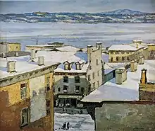 Later that year Chatterton began a relationship with a gallery owner that would persist for the remainder of the gallery owner's life.[5]: 34 The owner was Robert Macbeth and the gallery bore his name.[note 9] Macbeth, who was a staunch supporter of American artists like Chatterton, had little respect for European modernist influences in American art. Calling these influences "bizarre and unintelligible," he said the American public could be relied upon to choose art that was worthwhile over art that was "merely amusing."[33] Over the nine years from 1929 to 1938 Chatterton showed paintings in four solo and three group shows at Macbeth.[note 10] Although he stopped showing in commercial galleries after Macbeth's death in 1940, his work continued to be shown in noncommercial exhibitions in New York and across the country. In 1936 he was one of 40 artists chosen to represent New York City in a national exhibition of American art that was held in the newly completed International Building of Rockefeller Center.[36] In that year and two others his paintings were included in group shows of the Carnegie International in Pittsburgh. He showed at the annual exhibition of American art at the Art Institute of Chicago (1936), the large and successful Municipal Art Exhibit in New York (1936), the Albany Institute of History and Art (1939), the Golden Gate International Exposition in San Francisco (1940), and the Corcoran Gallery in Washington (1935, 1941, and 1943).[5]: 38 [37][38][39] During the early 1940s Chatterton participated in a number of group exhibitions and one solo exhibition held by the Dutchess County Art Association.[40][41][note 11] Vassar College, where he was professor of art, gave him exhibitions during the same period and in 1947 mounted a major retrospective of works from his own holdings, holdings of private collectors, and the Brooklyn Museum.[43][44] The following year he was given another retrospective, this one, sponsored by the Hudson River Conservation Society, featured his 1918 painting, "Clinton Square, Newburgh."[45] Further retrospective exhibitions occurred in 1959 (at the Bethlehem Art Gallery, Salisbury Mills, N.Y.) and 1963 (at Vassar College).[46][47]