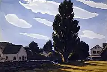 There is a gap during the next decade during which there are no records of exhibitions in which Chatterton participated. In that time he married, took up teaching positions, and was employed as a superintendent of art education in the Newburgh public school system.[5]: 34 Early on, he spent summer holidays in a rented studio in Newburgh where he made large paintings of the city's street scenes.[27][5]: 34 Later—beginning in 1919—he began to spend summers in the summer resort and art colony of Ogunquit, Maine. This marked a change in his choice of subjects. Where before he mostly painted street and harbor scenes on the Hudson River in the vicinity of Newburgh, he now began to find subjects in the villages on the coast of southern Maine.[5]: 34 Chatterton's painting, "Henry Wear's Place," of about 1920 (shown at right) is an example of his early work in Maine. When it was shown in 1927, Margaret Breuning of the New York Evening Post said "'Henry Weare's Place' with its beautiful elm, and umbrageous fountain spreading its beneficence over the little frame house huddling close to its great trunk, reveals the newer, mellower vein that this artist is developing with no loss of power in statement or design."[1]