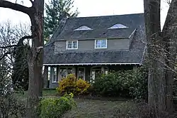 The C. Lewis Harrison House is a historic house at 14 Eliot Memorial Road in Newton, Massachusetts. The 1 3/4 story wood-frame house was built c. 1915 for Charles Lewis Harrison, a Boston lawyer. It is an excellent example of a Craftsman cottage, attractively set on a wooded lot overlooking the Commonwealth Country Club. Its roof has a large shed-roof dormer, above which there are two eyebrow windows. The roof slopes down over a porch, and is supported by large rustic concrete columns. The main entrance is traditional in appearance, with flanking sidelight windows and a fanlight above. Twin rubblestone chimneys rise from the sides of the house.[2]