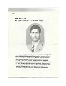 In view of his contributions to the theory of numbers, CSV was nominated for a visiting professorship at the University of North Carolina, Durham, NC, US. This was for possible collaboration with Leonard Carlitz, who learned of CSV's research interest. Though CSV wanted to continue with full-time research, s sudden turn of events in his family circumstances forced him to be near his home town and hence he accepted an offer of a lectureship at Union Christian College, Aluva. After spending a brief time there, he joined the Sree Kerala Varma College, Thrissur, in 1947, where he remained as a professor till retirement. The college he chose to serve had no pretensions of being in the elite league of colleges in Kerala, and it was usually dubbed as a common man's college.[1] Because of his passion for research and teaching, CSV also did not accept the post of the principal of the college, a position which was offered to him at a very young age. Due to CSV's active interest in research, the Department of Mathematics of Sree Kerala Varma College was recognized as a research centre for mathematics by the University of Kerala in 1961. A.C. Vasu and R. Sivaramakrishnan were his doctoral students.