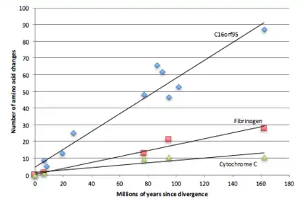 Graph of the corrected number of amino acid changes versus the approximate time of divergence. The corrected number of amino acid substitutions was calculated with the formula: – natural log (1 – observed number of substitutions) × 100. Data points are included for fibrinogen, a quickly evolving protein, and cytochrome c, a slowly evolving protein.[20]