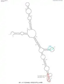 C1orf68 does not contain a 5'-UTR, but does contain a 3'-UTR. The predicted secondary structure of C1orf68's 3'-UTR mRNA contains various stem loops. The stem loop containing PUM2 RNA protein binding site, which was shown in all of the predicted structures created by mFold.[17]