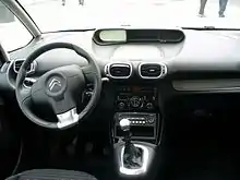All C3 Picasso models have an anti-lock braking system (ABS), Electronic brakeforce distribution (EBD), child locks, remote central locking and two front airbags.[34] Electronic Stability Control (ESC), once an option, is now included across the range.[35] The vehicle is only available as a 5-seater, but with all models the three rear seats can be folded flat to increase the boot capacity from 385 litres (13.6 cu ft) or 500 litres (18 cu ft) including the hidden compartment to store the parcel shelf, up to a maximum of 1,506 litres (53.2 cu ft).[36][37] The Exclusive model features a folding front passenger seat to increase the storage space further.[22][34] All models in the range have a "Mistral Maxi Taylor" woven cloth interior; according to Citroën, top European engineers and designers including Donato Coco and Jean-Pierre Ploué were involved in designing the vehicle.[38][39]