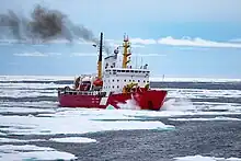 CCGS Des Groseilliers[note 1] is a Pierre Radisson-class icebreaker in the Canadian Coast Guard. The vessel is named after Médard Chouart des Groseilliers (1618–1669) a close associate of Pierre-Esprit Radisson in explorations west of the Great Lakes and the founding of the British Hudson's Bay Company. The ship entered service in 1982. The vessel has participated in a number of research voyages, including Ice Station SHEBA.[1] As part of the Surface Heat Budget of the Arctic Ocean experiment conducted in the Arctic Ocean from October 1997 to October 1998 to provide polar input to global climate models, Des Groseilliers was allowed to be frozen into the ice for the Arctic winter, to serve as a base for scientific researchers.