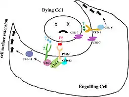 - ↑ Wang X, Wu YC, Fadok VA, Lee MC, Gengyo-Ando K, Cheng LC, et al. (November 2003). "Cell corpse engulfment mediated by C. elegans phosphatidylserine receptor through CED-5 and CED-12" (PDF). Science. 302 (5650): 1563–6. Bibcode:2003Sci...302.1563W. doi:10.1126/science.1087641. PMID 14645848. S2CID 25672278.