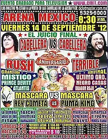 The main event of the 79th Anniversary Show was the highlight of a long running feud between the young tecnico Rush and the rudo' El Terrible that had been slowly building for almost a year leading up to the show. The first significant match between the two took place on November 13, 2011, as Rush successfully defended the CMLL World Light Heavyweight Championship against El Terrible.[8] The following month on December 25, Rush and El Terrible were the two final survivors in a torneo cibernetico match used to determine who would fight for the vacant CMLL World Heavyweight Championship the following week.[9] On January 1, 2012, El Terrible defeated Rush two falls to one to win the CMLL World Heavyweight Championship.[10] In February, Rush was teamed with El Terrible in the 2012 Torneo Nacional de Parejas Increibles ("National Incredible Pairs Tournament"), a tag team tournament where all teams were made up of rivals. Rush and El Terrible eventually made it to the finals of the tournament on March 2, 2012 at Homenaje a Dos Leyendas, where they were defeated by the team of Atlantis and Mr. Niebla.[11] Two days later, Rush successfully defended the CMLL World Light Heavyweight Championship against El Terrible.[12] Over the summer of 2012 the feud between the two escalated until a Lucha de Apuestas, or bet match, between the two was agreed to. In the weeks before the 79th Anniversary Show held their annual 2012 Universal Championship tournament. Since both Rush and El Terrible held CMLL championships they entered the tournament and ended up facing off in the semi-finals of the tournament. El Terrible won the match over Rush, after which El Terrible and his stablemate Rey Bucanero attacked Rush.[13][14] On September 9, only five days before the anniversary show, Rush defeated Rey Bucanero in a steel cage match to retain the CMLL World Light Heavyweight Championship.[15]