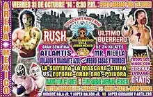 The October 31, 2014 Super Viernes show was the first of Mexican professional wrestling promotion Consejo Mundial de Lucha Libre's Dia de los Muertos ("Day of the Dead") celebrations and included six matches in total. As part of their Dia de los Muerte celebrations CMLL will admit all kids in costumes for free for this specific show.[23] CMLL will hold a second Dia de los Muerte celebration on Sunday November 2, both will include the Edcanes, CMLL's ring girls and various wrestlers dressed up, as well as turning the basement of Arena México into a haunted house attraction before each show.[24] The main event was a best two-out-of-three falls match between Rush and Último Guerrero. CMLL rarely books singles matches for their main events unless they are for a championship or a Lucha de Apuestas match ("Bet match"), pushing the rivalry between Rush's group Los Ingobernables and Guerrero's group Los Guerreros Lagunero that had been building for several weeks further into the spotlight and beyond being merely about the CMLL World Trios Championship that Los Guerreros Lagunero held, instead making it a personal rivalry between Rush and Último Guerrero. In the fourth match of the night the remaining Ingobernables (La Máscara and La Sombra) and Guerreros Lagunero (Euforia and Gran Guerrero) were on opposite sides of a six-man "Lucha Libre rules" tag team match; Los Ingobernables will team up with Stuka, Jr. while Los Guerreros Lagunero will team up with Pólvora.