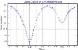 The light curve of CN Andromedae shows a primary eclipse, with its brightness dropping down to 10.21 magnitude, and a secondary one down to a magnitude of 9.9.[3] This phenomenon repeats with a cycle of approximately 11.1 hours, with period decreasing in time due to the mass transfer from one star to the other.[6]