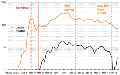 Denmark was among the first European countries to introduce lockdown measures, starting on 13 March.[3][4] Following a period of consistent increase in hospitalisations, the number of people in hospital with COVID-19 has been falling since late March, with the number of cases in need of intensive care and ventilator units, also at the peak in late March,[5] being well below available resources.[6] Starting on 15 April, a very slow and gradual reopening had been initiated.[7]