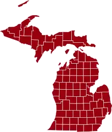 ![]() Map of the outbreak in Michigan by confirmed new infections per 100,000 people over 14 days (last updated March 2021)