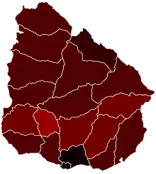 ![]() Departments of Uruguay with confirmed COVID-19 cases (as of 22 March 2021) Confirmed 1~4 Confirmed 5~9 Confirmed 10~49 Confirmed 50~99 Confirmed 100~499 Confirmed 500~999 Confirmed 1000~4999 Confirmed 10000~49999 | |