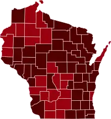 ![]() Map of the outbreak in Wisconsin by confirmed total infections per 100,000 people (last updated March 2021)