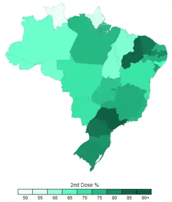 On August 25, 2021, the Ministry of Health announced that booster vaccination would begin on September 15 for people over 70 years who have been fully vaccinated for at least six months and for individuals with immunodeficiency fully vaccinated for at least 28 days.[79] On August 31, the cities of Salvador and Curitiba began administering booster doses to the elderly ahead of schedule,[80] soon followed by most other state capitals.[81]