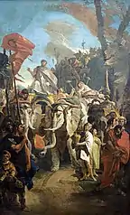 The Tarantine Triumph was the first work completed, depicting the triumph awarded to Manius Curius Dentatus after defeating Pyrrhus of Epirus in the Battle of Beneventum, the last battle of the Pyrrhic War in 275 BC, at which captured elephants were first seen in Rome. The Triumph of Marius was the last completed, depicting the triumph awarded to Gaius Marius after defeating Jugurtha of Numidia in the Jugurthine War: it is dated 1729, and includes a self-portrait of Tiepolo on the left. The differences in style and composition between the works demonstrate Tiepolio's rapid development as a painter.