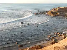 One of the most thriving and diverse animal communities of Cabrillo National Monument is located in the intertidal zone and tide pools. The species that live in the tide pools include coralline algae, chitons, true limpets, acorn barnacles (Sessilia), goose neck barnacles, rock louse, sea lettuce, kelp fly (Coelopa frigida or seaweed fly), pink thatched barnacles, encrusting algae, periwinkles, mussels (Mytilus californianus), dead man's fingers (Codium fragile), sea bubbles, unicorn snail (Acanthina spirata), anemones, Tegula top snails, sculpin, aggregating anemone, sandcastle worms, hermit crabs, rockweed (Silvetia fastigiata), wavy turban snails (Turbo fluctuosus), keyhole limpet (Fissurellidae), brittle star, surfgrass, surfgrass limpet, kelp crab, garibaldi, sea hare, opaleye, bat star, knobby blue star, sea urchin, sargassum weed, feather boa kelp, octopus, chestnut cowry, sea palm, ruddy turnstone, and lined shore crab.[11] The Monument advises that the best time to see the tide pools is in the late fall or winter, when tides are rated at negative one or lower during daylight hours.[12]