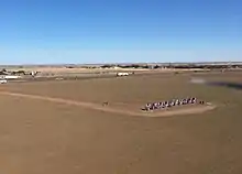 Cadillac Ranch was originally located in a wheat field, but in 1997, the installation was quietly moved by a local contractor to a location two miles (three kilometers) to the west, to a cow pasture along Interstate 40, in order to place it farther from the limits of the growing city.[6] Both sites belonged to the local millionaire Stanley Marsh 3, the patron of the project.[7] Marsh was well known in the city for his longtime patronage of artistic endeavors including the Cadillac Ranch; Floating Mesa; Amarillo Ramp, a work by land artist Robert Smithson; and a series of fake traffic signs throughout the city known collectively as the Dynamite Museum.[8] As of 2013, Stanley Marsh 3 did not own the Cadillac Ranch;[9] ownership appears to have been transferred to a family trust some time before his June 2014 death.