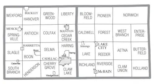 The Cadillac micropolitan area is a micropolitan statistical area (μSA) defined by the United States Census Bureau as an area encompassing two counties (Missaukee and Wexford) in the U.S. state of Michigan. The population of the μSA was 48,725 at the 2020 census (33,673 in Wexford County and 15,052 in Missaukee County).[1][2]