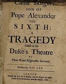 Caesar Borgia, Son Of Pope Alexander The Sixth is a 1679 tragedy by the English writer Nathaniel Lee. It was first staged at the Dorset Garden Theatre by the Duke's Company. The prologue was provided by John Dryden.