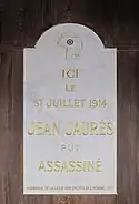 The assassination is still remembered in the café: in 1923, a commemorative plaque was added to the façade by the Human Rights League;[4] a red and golden floor mosaic shows the date of Jaurès's death and the exact place where he fell.[5] Additionally, a window shelters a part of Jaurès's chair, his hat with a bullet inside,[6] and the two front pages of the newspaper L'Humanité of 31 July and 1 August 1914.[7]