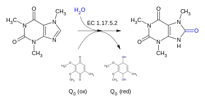 Caffeine dehydrogenase is responsible for catalyzing the oxidation of caffeine directly into trimethyluric acid, and the enzyme uses coenzyme Q0, also known as ubiquinone, as an electron acceptor. This is done by incorporating an oxygen atom from a water molecule into the C-8 position, and the overall reaction can be seen in the following chemical reaction: