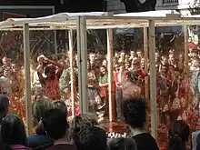 At Goldsmiths College in London they scattered £1,200 around a room to point to the commercialism and greed of the art market. The audience scrambled on the floor to pick up the money.[5]