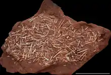 The holotype, CP.V 1449, was found in a sandstone layer of the Goio-Erê Formation, of Early Cretaceous age,[5] in the Paraná Basin.[6] It consists of a partial skeleton including the skull, lower jaws, neck vertebrae and wing elements. Many hundreds of bones have been discovered, concentrated in several bone beds, and representing at least forty-seven individuals but probably many more. In the total assembly, all elements of the skeleton are present. The bones have been three-dimensionally preserved, not compressed, but are only rarely articulated. The individuals found are often juveniles; adult animals are much rarer, only represented by two skulls and three humeri. Good specimens have been assigned as paratypes, the more fragmentary ones have been referred.[4]