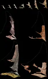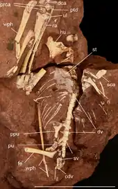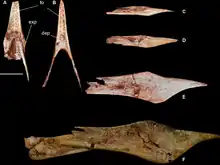 The paratypes are: CP.V 865: a snout, rear of the mandibula, right jugal, vertebrae, ribs and metatarsals; CP.V 867: a snout and limb bones; CP.V 868: a snout, wing elements and other postcrania; CP.V 869: a vertebral column, right arm, coracoid, breastbone, wing phalanges, belly ribs, pelvic elements and a right thighbone; CP.V 870: a shoulder girdle with the humeri; CP.V 871: a right shoulder girdle with right arm elements; CP.V 872: s partial skeleton including the skull, lower jaws, right arm, neck vertebrae and additional limb elements; CP.V 873: a snout and finger phalanges; CP.V 999: a partial skull; CP.V 1001: a slab with a partial skull, lower jaws and postcrania of at least three individuals; CP.V 1003: a partial skull and symphysis; CP.V 1004: a snout; CP.V 1005: a partial crested skull with the complete mandibula; CP.V 1006: a partial crested skull lacking the snout combined with postcrania; CP.V 1023: a snout and postcrania; CP.V 1024: a skull and postcrania of at least three juveniles; CP.V 1025: a thighbone; CP.V 1026: a thighbone; CP.V 1450: a slab containing at least fourteen juveniles; CP.V 2003: a skull with lower jaws and articulated wing elements; UEPG/DEGEO/MP-4151: a slab with two skulls and postcrania; and UEPG/DEGEO/MP-4152: a snout with postcrania.[4]