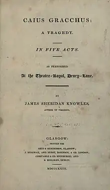 Caius Gracchus is a tragedy by the Irish playwright James Sheridan Knowles. It is based on the life of Gaius Gracchus, a politician in Ancient Rome. The play premiered at the Belfast Theatre in 1815 and enjoyed a good reception.[1] It debuted in London's West End at the Theatre Royal, Drury Lane on 18 November 1823, following the success of the author's Virginius.[2] The London cast included William Macready as Caius Gracchus, William Penley as Licinius, Alexander Pope as Drusus, Daniel Terry as Titus, Charles Mayne Young as Vettius, George Yarnold as Fulvius Flaccus, Thomas Archer as Opimius, Mrs. West as Licinia and Margaret Bunn as Cornelia.