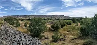 The landscape of the Caja del Rio Plateau is generally flat to rolling terrain, with numerous steep cones rising up to 800 feet above the plains. The highest points in the immediate area are the unnamed high point (7,472 feet), Cerro Micho (7,326 feet), Montoso Peak (7,315 feet), Ortiz Mountain (7,188 feet),[1] and Cerro Rito (7,296 feet) The entire plateau is within the watershed of the Rio Grande; portions of the Caja drain into the larger river through two tributaries: the Santa Fe River and Cañada Ancha.