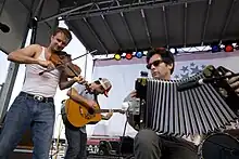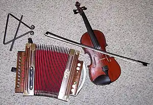 Traditional Cajun instruments: tit-fer, Cajun accordion, and a fiddle.