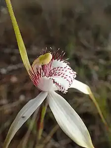 Caladenia splendens, commonly known as the splendid spider orchid,[2] or splendid white spider orchid[3] is a species of orchid endemic to the south-west of Western Australia. It has a single erect, hairy leaf and up to three mostly white flowers with a fringe of long teeth on the sides of the labellum. Along with the giant spider orchid, Caladenia excelsa it is the largest of the spider orchids.