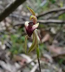 - ↑ "Thick-lip spider orchid profile". New South Wales Government Office of Environment and Heritage. Retrieved 23 March 2017.