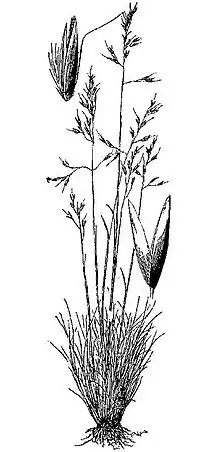 This is a perennial grass without rhizomes which form tufts and bunches up to about 50 centimeters in maximum height, but generally shorter. The small, sparse leaves are mainly located at the base of the stems. The inflorescence is small, scattered and reddish, with spikelet about half a centimeter long.