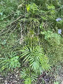 Fertile inflorescences are up to 1 m (3 ft 3 in) long and flowering occurs in all months of the year.[5] The fruits are a globose drupe about 12–16 mm (0.47–0.63 in) in diameter, containing a single seed.[4][5][6]