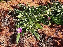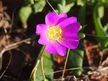 There are three to four flowers at the top of each stem or on short leafy branches.[2] Flowers are vivid dark pink or purple with five petals 11 to 15 mm long and bright yellow stamens in the center.[3] The flowers open during the day and close just before sunset. The fruit is a small capsule that contains numerous dark-red seeds. The capsule is 5 to 9 mm long and 4 to 7 mm wide, and the seeds are at least 1 mm in diameter.[2]
