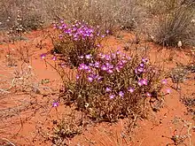 R. balonense has been classified as a “drought evader,” a short-lived plant that spends most of its life as a dormant seed or a small plant, until a large rainfall event triggers germination or growth, in contrast to “drought tolerators” which are perennial plants that can survive long periods without rainfall.[18] In drier periods R. balonense can grow as a small single rosette. After significant rainfall it rapidly develops from this single rosette to a large green mass of leaves and stems that can carpet the sandplains and dunes with massed, colourful displays.[8] It tends to last longer than most arid or semi-arid zone annuals because of its ability to store water in its succulent leaves.[19] R. balonense may flower any month but is most commonly reported to do so in spring.[6][2]