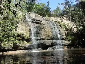 The Caldas Novas State Park is in the municipalities of Caldas Novas and Rio Quente, Goiás. It has an area of 12,315 hectares (30,430 acres).[1] The park is 5 kilometres (3.1 mi) from the municipal center of Caldas Novas, and 174 kilometres (108 mi) from Goiânia. It protects a remnant of the cerrado biome surrounded by farms and urban areas. The park is elliptical, covering the large plateau of the Serra de Caldas and its sides, which form natural walls.[2] The Serra is also called the Caldas Ridge or the Structural Dome of Caldas. It rises to about 1,000 metres (3,300 ft), although the surrounding terrain is at about 600 metres (2,000 ft).[3]