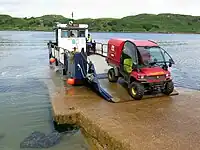 MV Lochnevis is a highly specialised ship serving the Small Isles of Eigg, Canna, Rùm and Muck from Mallaig. She is 49.2 m (161 ft 5 in) long, and has capacity for 190 passengers. Her vehicle deck can accommodate up to 14 cars, but is empty on most sailings due to the lack of roads and vehicle restrictions on the Small Isles. She is instead used mostly for goods and vital equipment for the islands. Lochnevis has a surprisingly large vehicle ramp, which dominates her appearance.[27] This allows her to berth a considerable distance from slipways, protecting her exposed Azipod propulsion systems in shallow waters.
