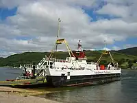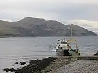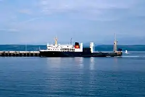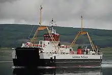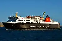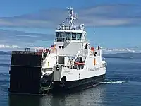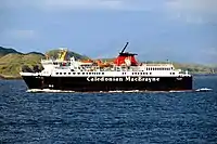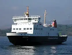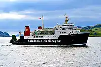 MV Coruisk is a 65 m (213 ft) "sheltered water vessel", operating on the Mallaig to Armadale route in summer, and relieving on the Clyde in winter.[26] Her design allows her to make the crossing in reverse when sea conditions allow.[26]