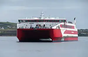 MV Alfred is a 84.5 m (277 ft) catamaran ferry chartered from Pentland Ferries for 9 months from April 2023.[31] She can carry 98 cars and 430 passengers. She operated the Ardrossan - Brodick route from May to September 2023. Berthing trials at Stornoway[32] in October 2023 were unsuccessful. She underwent bow thruster repairs before taking over the Arran service, allowing Caledonian Isles to carry out berthing trials at Islay, Colonsay, Mull, Coll & Tiree. Her charter was extended by 6 months on 6 November 2023 to last until 21 August 2024.[33] During November and December, due to a technical issue with MV Loch Portain, Alfred provided a service between Tarbert and Lochmaddy.[34] She then partnered Isle of Arran on the Arran service during Caledonian Isles' overhaul.