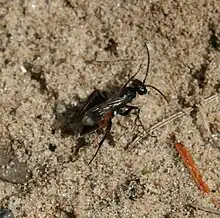 It hunts orb web spiders of the genera Araneus and Meta.[5] It excavates short, vertical burrows in sandy substrate once the prey has been caught. The prey is gripped in the jaws, between the thorax and abdomen, and transported to the burrow by being carried in front of the wasp. The prey is placed in a vertical position in the cell.[4]
