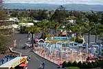 The park is divided into several themed areas, laid out along an oval pathway nicknamed the "Duell Loop", which the park's designer, Randall Duell, had incorporated into several theme parks, including the Six Flags Great America sister park in Gurnee. This allows all areas of the park to be serviced from a central corridor, while visitors can experience the entire park by completing a single lap around it.[40] In aerial photographs, the central service corridor in the Santa Clara park is visible as a straight road running almost directly north–south, terminating under the Patriot roller coaster. At the park's opening in 1976, there were five themed areas:[6]
