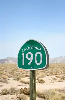 State Route 190 (SR 190) is a state highway in the U.S. state of California that is split into two parts by the Sierra Nevada. The western portion begins at Tipton at a junction with State Route 99 and heads east towards Porterville before ending at Quaking Aspen in the Sequoia National Forest. The eastern portion begins at US 395 at Olancha, heads east through Death Valley National Park, and ends at State Route 127 at Death Valley Junction. The 43.0-mile[2] (69.2 km) portion over the Sierra Nevada remains unconstructed, and the California Department of Transportation (Caltrans) has no plans to build it through the wilderness areas.[3] SR 190 is a National Scenic Byway known as the Death Valley Scenic Byway.