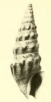 (Original description) The brownish shell is pale on the early whorls, with a whitish glaze and polished. The shell is acute, except for the apex of the protoconch, which is flattened. The protoconch is smooth and polished. It contains two whorls, the second sharply keeled and passing gradually into the sculpture of the subsequent 8½ whorls. The suture is strongly appressed behind the concave arcuately striated anal fasciole. The axial sculpture shows (on the body whorl 10) prominent protractive ribs extending from the fasciole to the succeeding suture on the spire and somewhat over the periphery on the body whorl. These ribs are knob-like and prominent on the periphery and rapidly diminish forward. The incremental sculpture is faint. The spiral sculpture begins on the early whorls with about four faint striae which grow sharper on the later whorls which carry four or five grooves with wider flattish interspaces between the periphery and the succeeding suture, with on the later whorls sometimes one or two on the anal fasciole. On the body whorl there are 16 or more in all. The last rib on the body whorl is more swollen than the others and usually darker in color. The aperture is narrow. The outer lip is thin, sharp, produced, smooth internally with a deep rounded anal sulcus close to the suture with a heavy lump of callus on the side of the body. The inner lip has a rather thick callus with a raised edge extending to the end of the columella. The siphonal canal is short, wide, deeply cut, with a small keel bordering the posterior edge of the siphonal fasciole. The operculum is dark brown.[3]