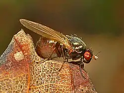 Most, but not all, are luscious black or metallic flies.[1] They are smaller than 5 mm and usually have iridescent eyes. Adults can be found from May until December in meadows and hedge rows.[2] The larvae may be phytophagous or saprophagous, mainly feeding on rotting vegetable matter or mining clover leaves.[3]