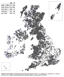 The habitats ranges from ephemeral pools, lakes and canals to fast-flowing upland rivers Europe-wide.[2] This species can be found in ditches, ponds, wetlands, and in shallow waters of lake margins and drains. The Callitriche bruita is most abundant in the upland regions of Britain and Ireland, as well as areas in the New Forest (South Hampshire) and the Lizard Peninsula (West Cornwall).