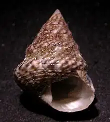 The strong, opaque shell has a conical shape. It is carinated and flat on the base. It is covered with tubercles, and colored with gray and pink. Its sculpture shows eight spiral rows of small round tubercles on each whorl. The tubercles on the first two rows, are larger than the others; these, as well as the next three rows, are parted by distinct depressions. The lowest three rows are much closer together, but project a little, especially the center and largest row of the three. On the base there are about nine less strongly tuberculated spiral threads with feebler threads between. These intermediate threads become feebler towards the center. The tubercles are smooth and polished, but the whole intervening surface is sharply fretted with fine oblique puckerings.