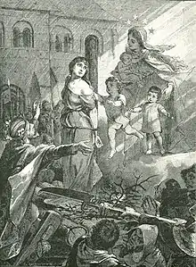 The Virgin Mary halts the queen's execution by bringing the maiden's children.