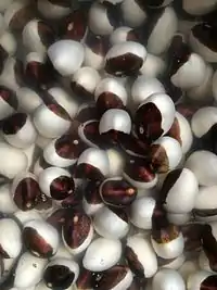 Calypso beans are best known for the distinctly colored variety, with a striking contrast of black and white.[2] The beans are half black, half white, with one or two black dots in the white area, though there is also a red and white variety.[1]
